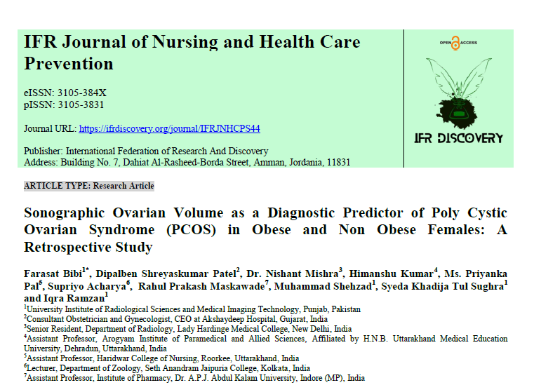 | Sep, 2025 | Sonographic Ovarian Volume as a Diagnostic Predictor of Poly Cystic Ovarian Syndrome (PCOS) in Obese and Non-Obese Females: A Retrospective Study | IFR Journal of Nursing and Health Care Prevention | 2 | Supriyo Acharya and others | 3105-3831 | None | 2022 | Yes | 2022 | 0.2 | Document | |
