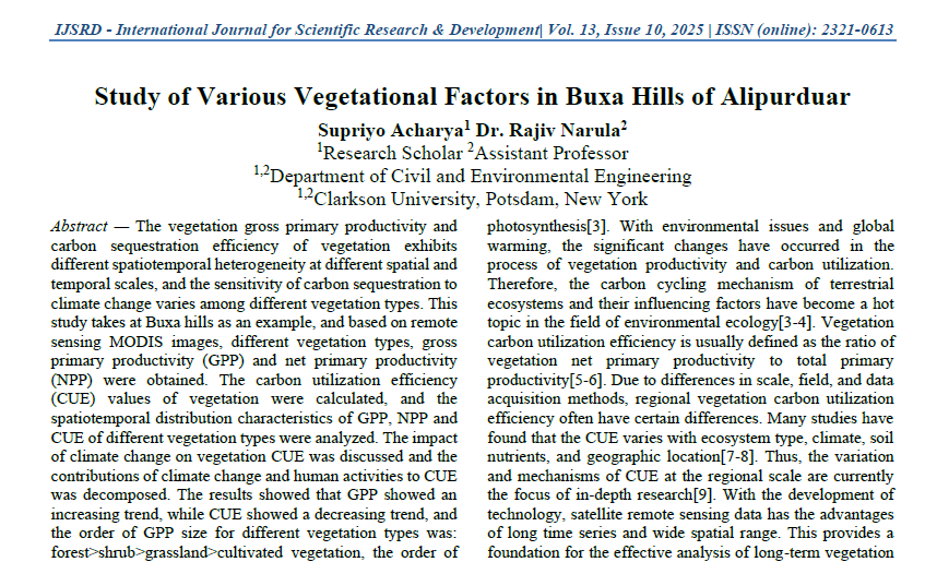 | Nov, 2025 | Study of Various Vegetational Factors in Buxa Hills of Alipurduar | International Journal for Scientific Research and Development | 13 | Supriyo Acharya and others | 2321-0613 | None | 2022 | Yes | 2022 | 4.9 | Document | |