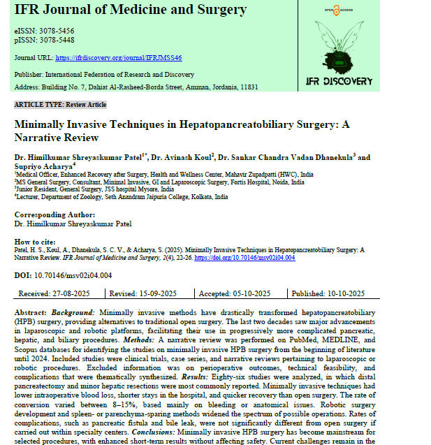 | Oct, 2025 | Minimally Invasive Techniques in Hepatopancreatobiliary Surgery | IFR Journal of Medicine and Surgery | 3 | Supriyo Acharya and others | 3078-5456 | None | 2022 | Yes | 2022 | 0.2 | Document | |