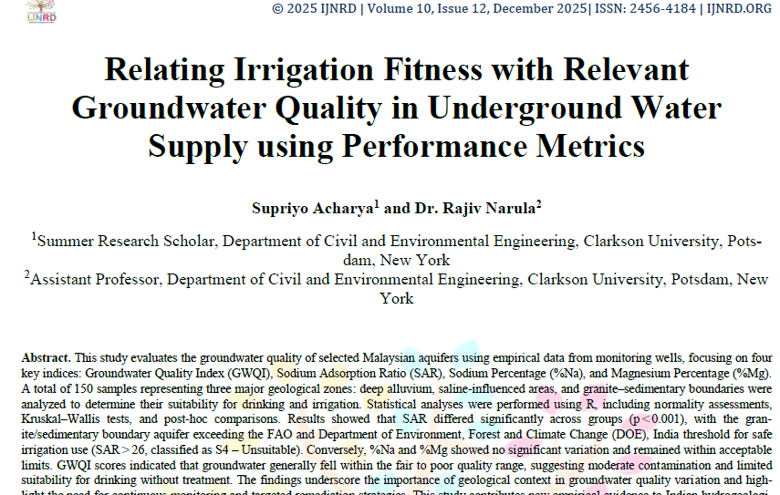 | Nov, 2025 | Relating Irrigation Fitness with Relevant Groundwater Quality in Underground Water Supply using Performance Metrics | International Journal of Novel Research and Development | 10 | Supriyo Acharya and others | 2456-4184 | None | 2022 | Yes | 2022 | 8.7 | Document | |