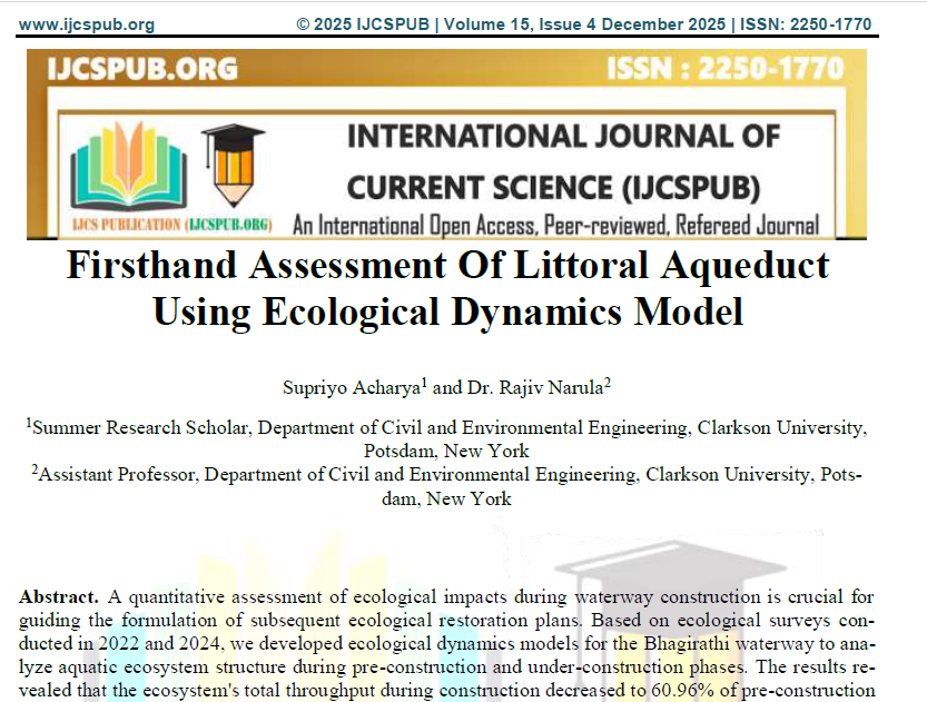| Dec, 2025 | Firsthand Assessment of Littoral Aqueduct using Ecological Dynamics Model | International Journal of Current Science | 15 | Supriyo Acharya and others | 2250-1770 | None | 2022 | Yes | 2022 | 8.17 | Document | |
