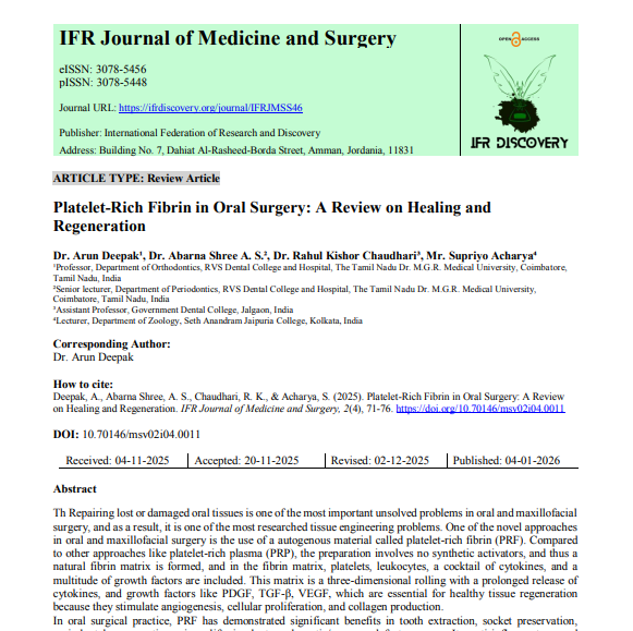 | Jan, 2026 | Platelet-Rich Fibrin in Oral Surgery: A Review on Healing and Regeneration | IFR Journal of Medicine and Surgery | 2 | Supriyo Acharya and others | 3078-5456 | None | 2022 | Yes | 2022 | 0.2 | Document | |