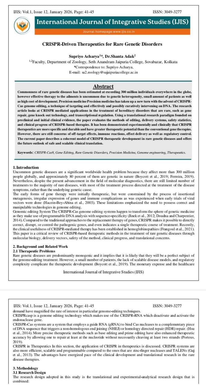 | Jan, 2026 | CSIPR-Driven Therapeutics in Rare Genetic Disorders | International Journal of Integrative Studies | 1 | Supriyo Acharya and Dr. Shanta Adak | 3049-3277 | None | 2022 | Yes | 2022 | 1.2 | Document | |