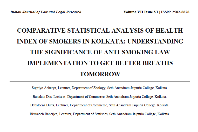 | Jan, 2026 | Comparative Statistical Analysis of Health Index of Smokers in Kolkata: Understanding the Importance of Anti-smoking Law for Better Breathes Tomorrow | Indian Journal of Law and Legal Research | 7 | Supriyo Acharya, Banalata Das, Debaleena Dutta and Biswadeb Banerjee | 2582-8878 | None | 2022 | Yes | 2022 | 6.6 | Document | |