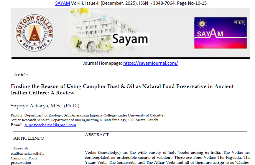 | Dec, 2025 | Finding the Reason of Using Camphor Dust & Oil as Natural Food Preservative in Ancient Indian Culture: A Review | SAYAM- A Journal of Asutosh College. | 3 | Supriyo Acharya | 3048-7064 | None | 2025 | Yes | 2023 | 1.2 | Document |